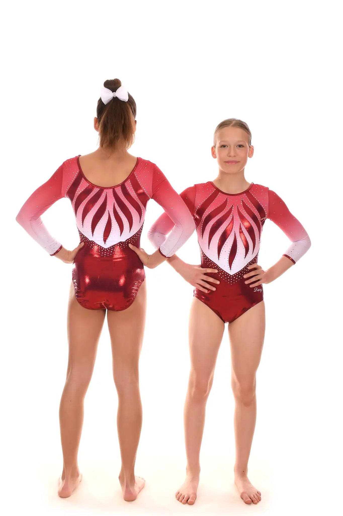 Make a bold statement on the floor, beam or bars in this dazzling competition-ready leotard, designed to turn heads and fuel confidence. The Red Flame features a rich ombré blend of deep crimson to white, layered with shimmering flame motifs and scattered diamanté sparkles that catch the light with every move.