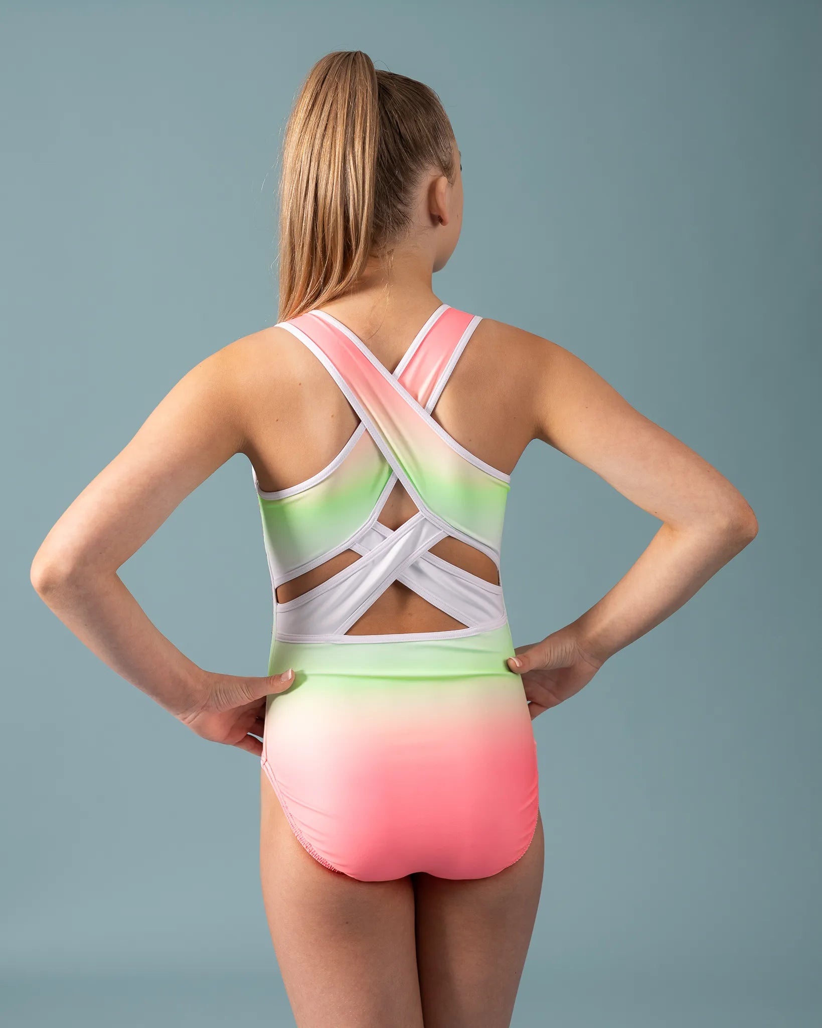 This stunning full Lycra leotard features an eye-catching ombré blend of Coral, Bright Green and White, designed to make a statement. A radiant scatter of super sparkly AB Korean stones dances across the front bodice, catching the light with every move and adding just the right amount of dazzle to your routine.