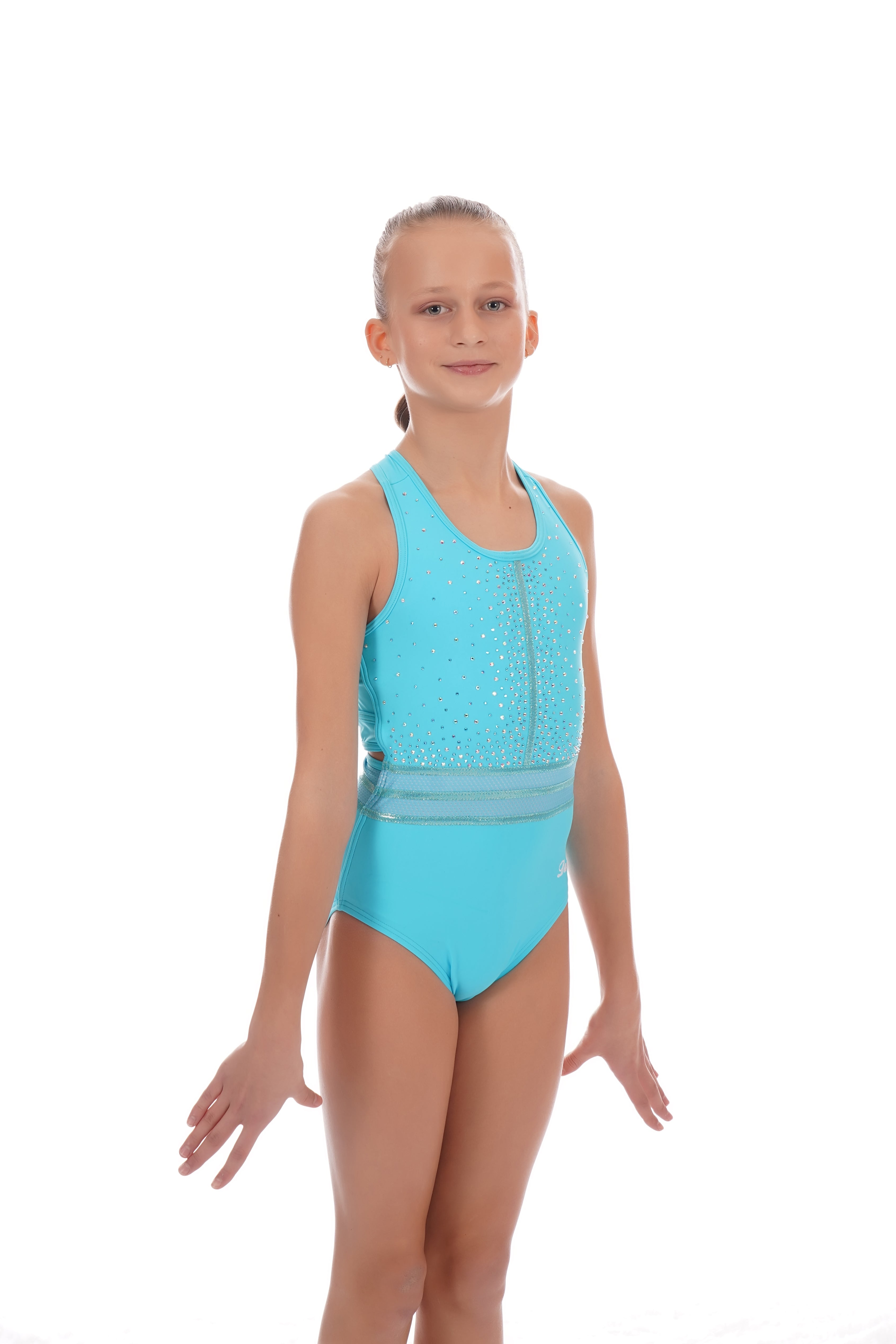 This energetic design features Ocean Blue Lycra with sparkling mystique straps and appliqué. With the built-in SPORTS BRA (from AXS 32”+) and full lining, it combines sporty strength with eye-catching style for gymnasts who give their all.