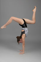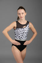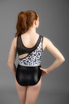Native features a black satin Lycra base with a snow leopard-print mesh bodice overlay and silver satin Lycra waistband appliqué. AB crystals add shimmer throughout, while the open back design creates a striking silhouette from every angle.
