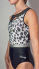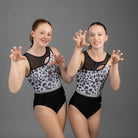 Black satin Lycra with snow leopard mesh and silver accents—bold, sleek, unforgettable.