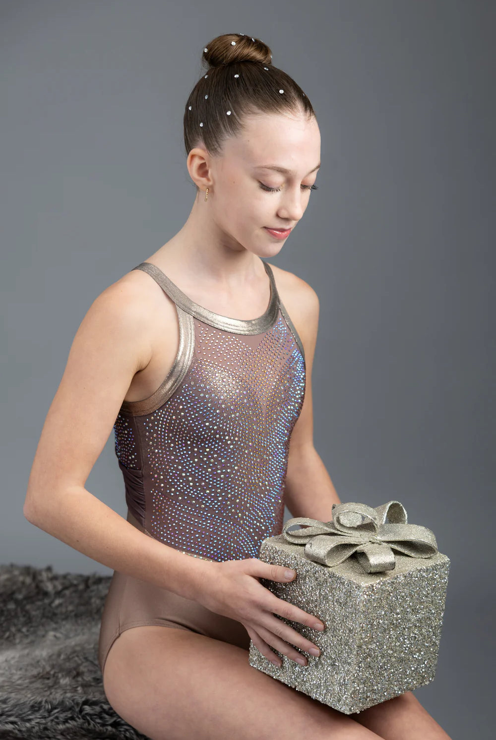 Erweitern Sie Ihre Trainingsgarderobe mit satinartigem Glanz, zartem Mesh und lichtreflektierenden Kristallen. Die Couture-Gift-Kollektion verbindet elegante Silhouetten mit komfortabler Performance, strahlt unter den Lichtern und ist mühelos in Bewegung. Für die Turnerin, die hart trainiert und hell erstrahlen möchte.