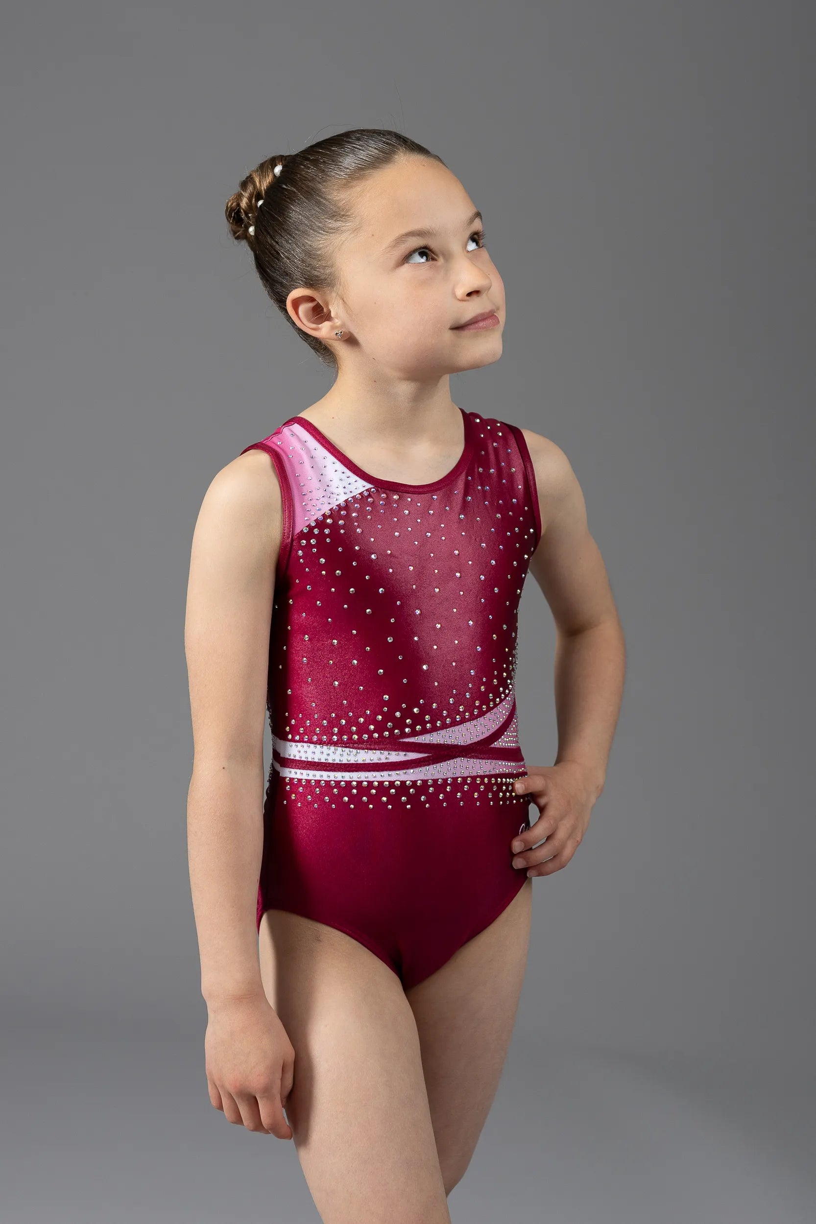 Gefertigt aus sattem Deep Burgundy Satin Lycra, verfügt Charm über weiche Ombre-Mesh-Einsätze, die wunderschöne Formlinien am Körper schaffen. Das schimmernde AB-Kristalldesign verleiht einen luxuriösen, kraftvollen Glanz, der bei jeder Bewegung das Licht einfängt.