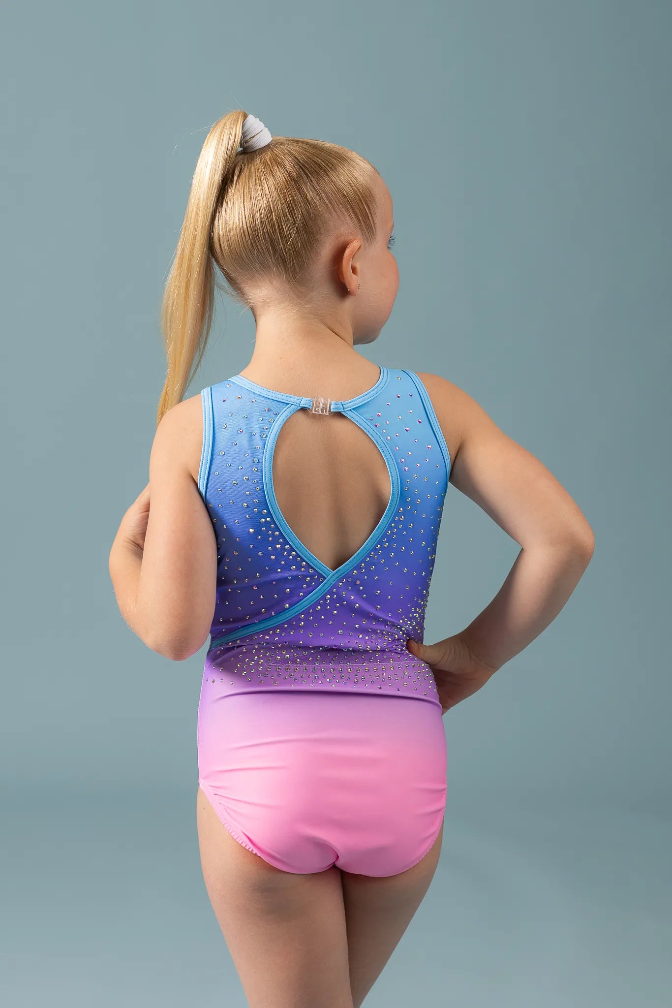Der Daydream Turnanzug verbindet eine sanfte, vom Himmel inspirierte Farbpalette aus Himmelblau, Puderrosa und Flieder zu einem Wirbel aus Eleganz und Ruhe. Wunderschön geformte Mesh-Einsätze über den Schultern und dem Oberteil verleihen ein luftiges Finish, während eine Streuung von super funkelnden AB Korean Steinen genau die richtige Menge Glanz in deine Routine bringt.