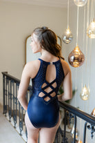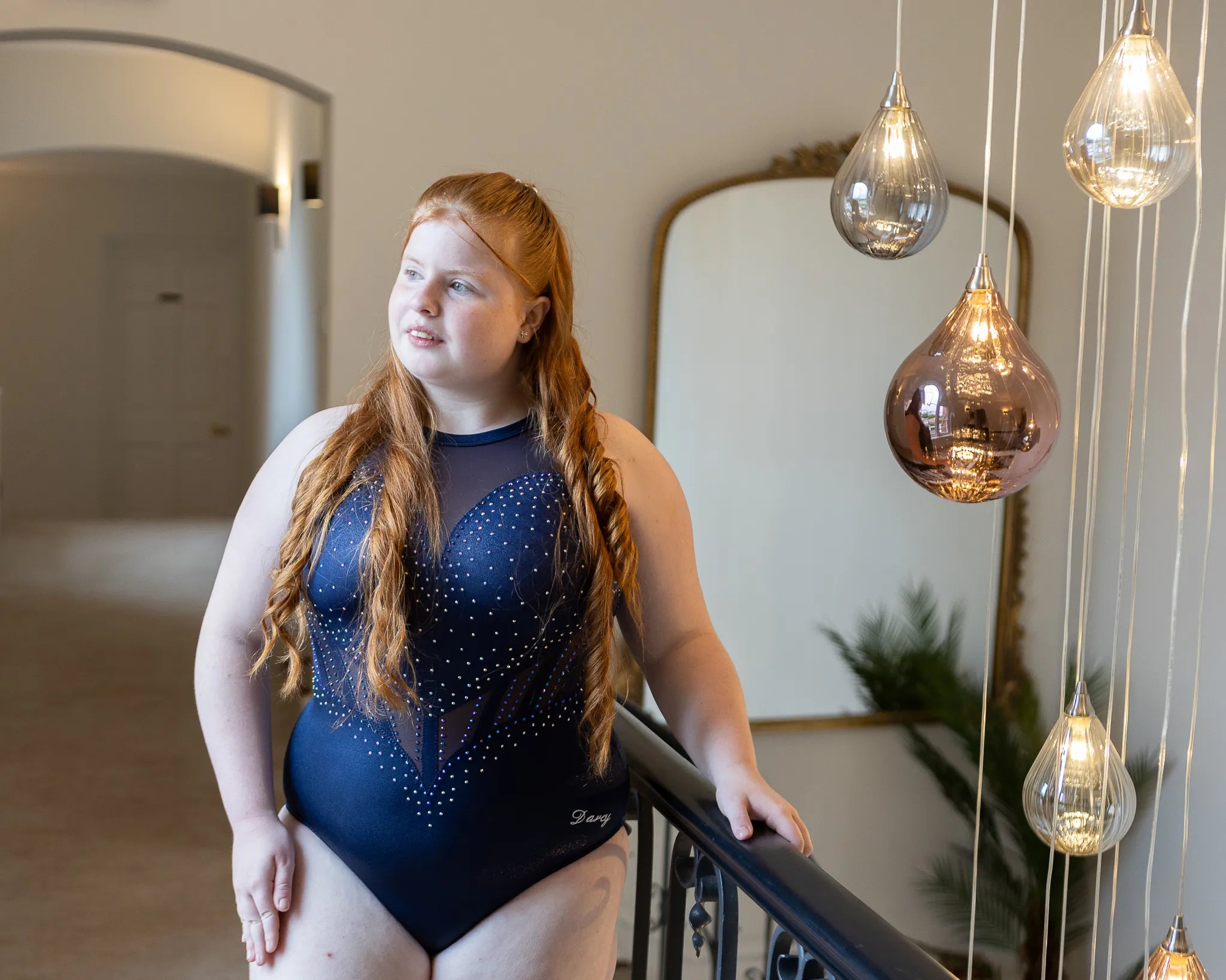 Das elegante und stilvolle Mia ist der perfekte Turnanzug für Turnerinnen, die gerne mit Stil auftreten. Der Turnanzug in Navy Mystique mit marineblauen Mesh-Einsätzen an der Taille und schmeichelhaftem Sweetheart-Ausschnitt ist mit den schönsten Crystal AB und dunkelblauen/schwarzen Steinen verziert! Mit einem eleganten hohen Hals und schönen offenen Rücken mit breiten Riemen Detail Mia ist unaufdringlich Eleganz personifiziert!