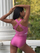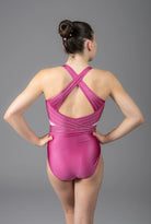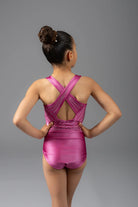 Der Poise Turnanzug ist ein Statement-Stück in einem satten beerenrosa Farbverlauf mit auffälligen geometrischen Details und funkelnden Kristallen rundum. Die Racerback-Silhouette verleiht sportliche Eleganz, während der Rundhalsausschnitt und die strukturierte Form Halt und Flair bieten.