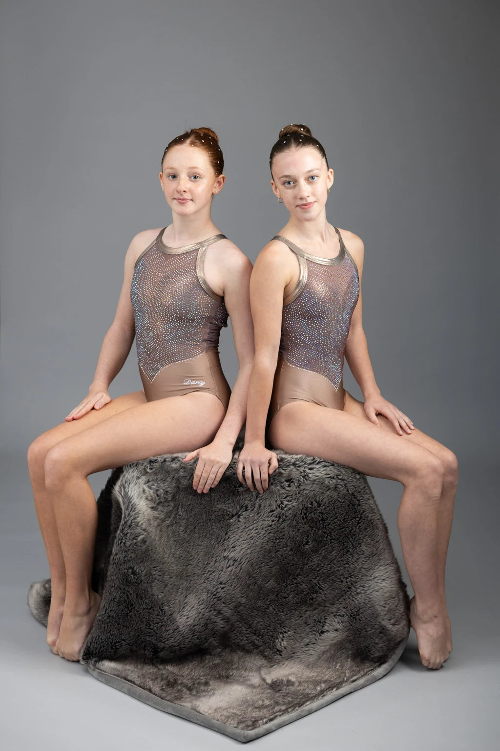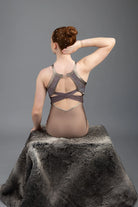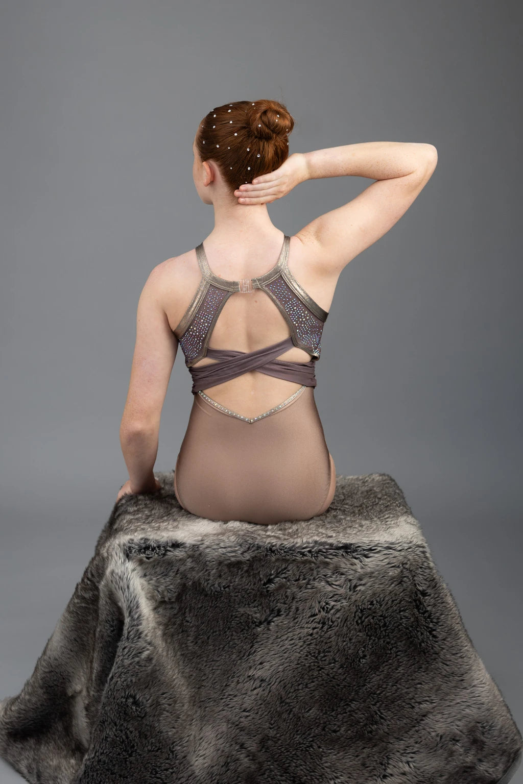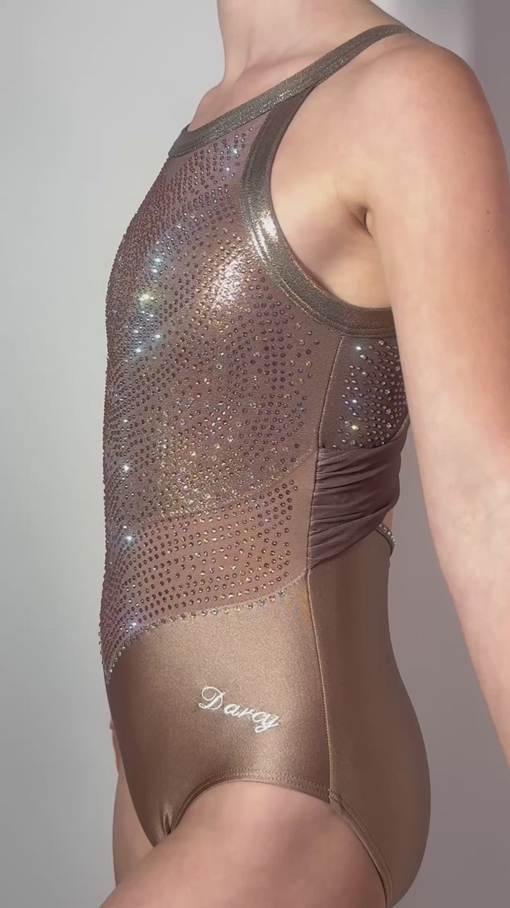 Gefertigt aus leuchtendem bronze Satin Lycra, zieht der Lavish Turnanzug aus jedem Blickwinkel alle Blicke auf sich. Ein raffinierter hoher Kragen und ein anmutiger offener Rücken formen die Silhouette, während zarter