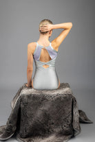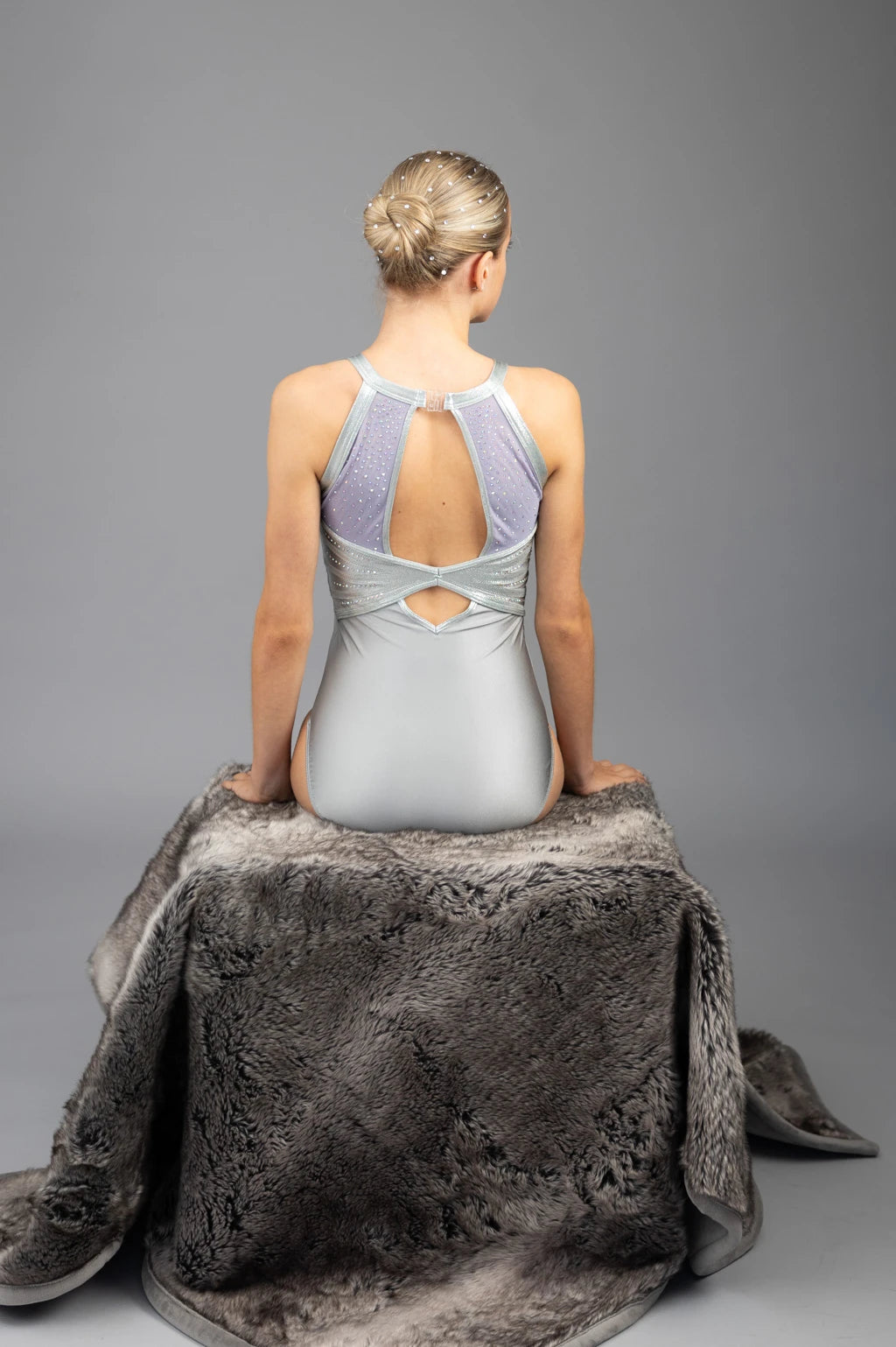 Makellos gefertigt aus leuchtendem Silber Satin Lycra, bringt der exquisite Turnanzug Couture-Eleganz in jede Routine. Ein raffinierter hoher Kragen und ein anmutiger offener Rücken formen die Silhouette, während zarte Applikationen und sorgfältig platzierte AB-Kristalle einen strahlenden, mehrdimensionalen Schimmer erzeugen, der mit dir mitbewegt.
