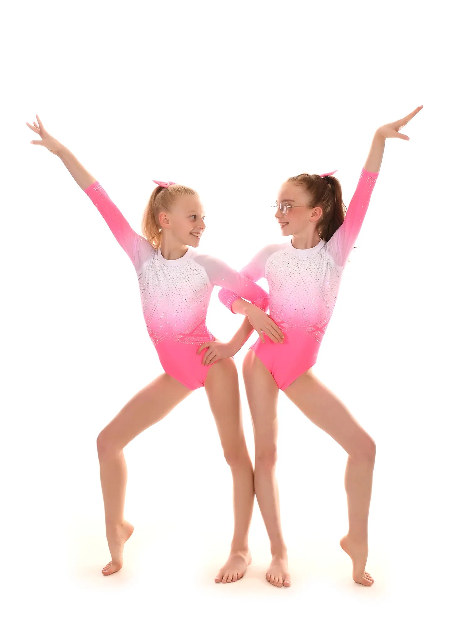 Bereiten Sie sich darauf vor, von diesem wunderschönen Turnanzug umgehauen zu werden! In einer auffälligen Farbkombination aus leuchtendem Pink und Weiß, mit langen Ärmeln, schmeichelnden Netzeinsätzen und mystischen Applikationen an der Taille - dieser Turnanzug ist ein echter Hingucker! Strawberry Fizz ist mit glitzernden AB- und Jelly-Pink-Steinen verziert und hat einen eleganten hohen Halsausschnitt und ein schönes Rückendetail. Vollständig gefüttert für Komfort und Bescheidenheit dieser Turnanzug hat wirklich die Farbe Pop Sie für diese Saison suchen!