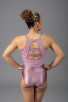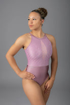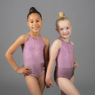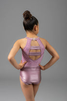 Der Refine Turnanzug verfügt über eine weiche Blush Satin Lycra Basis, veredelt durch ein zartes Mesh-Oberteil, das mit funkelnden AB- und Amethyst-Kristallen geschmückt ist. Der hohe Kragen und der ordentliche Verschluss verleihen ihm ein ultra-poliertes Finish, während die filigrane Steinverzierung bei jeder Bewegung schimmert.