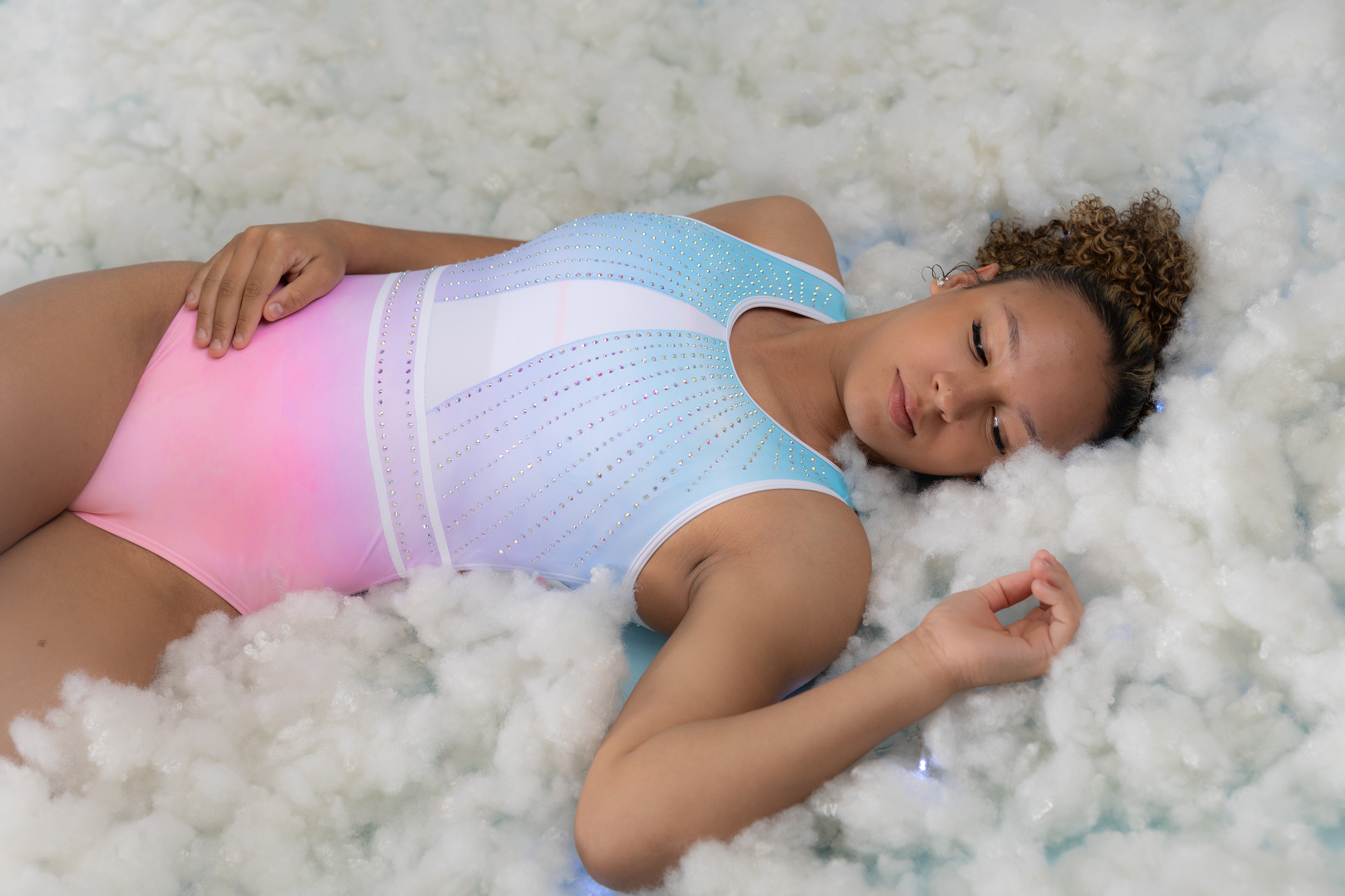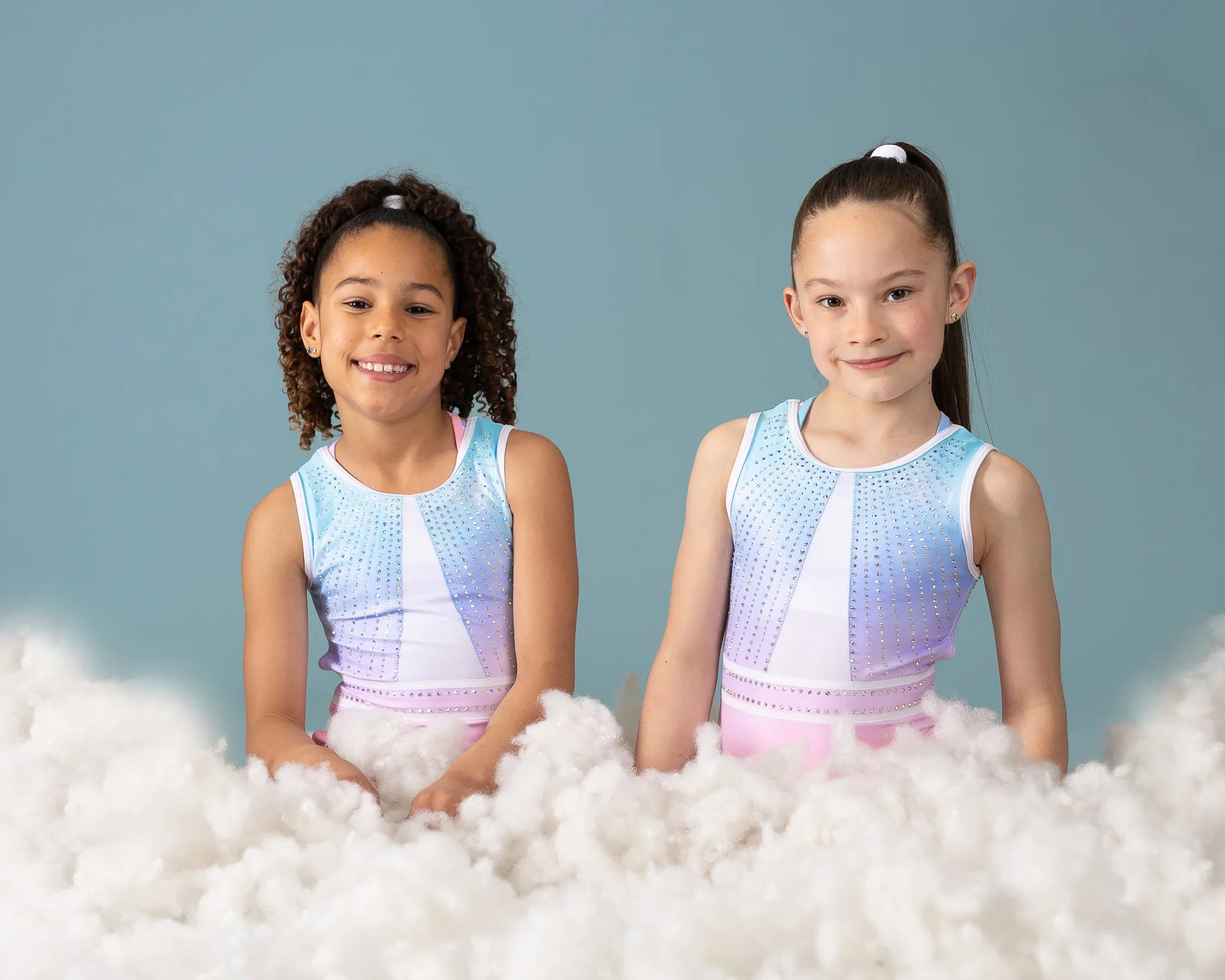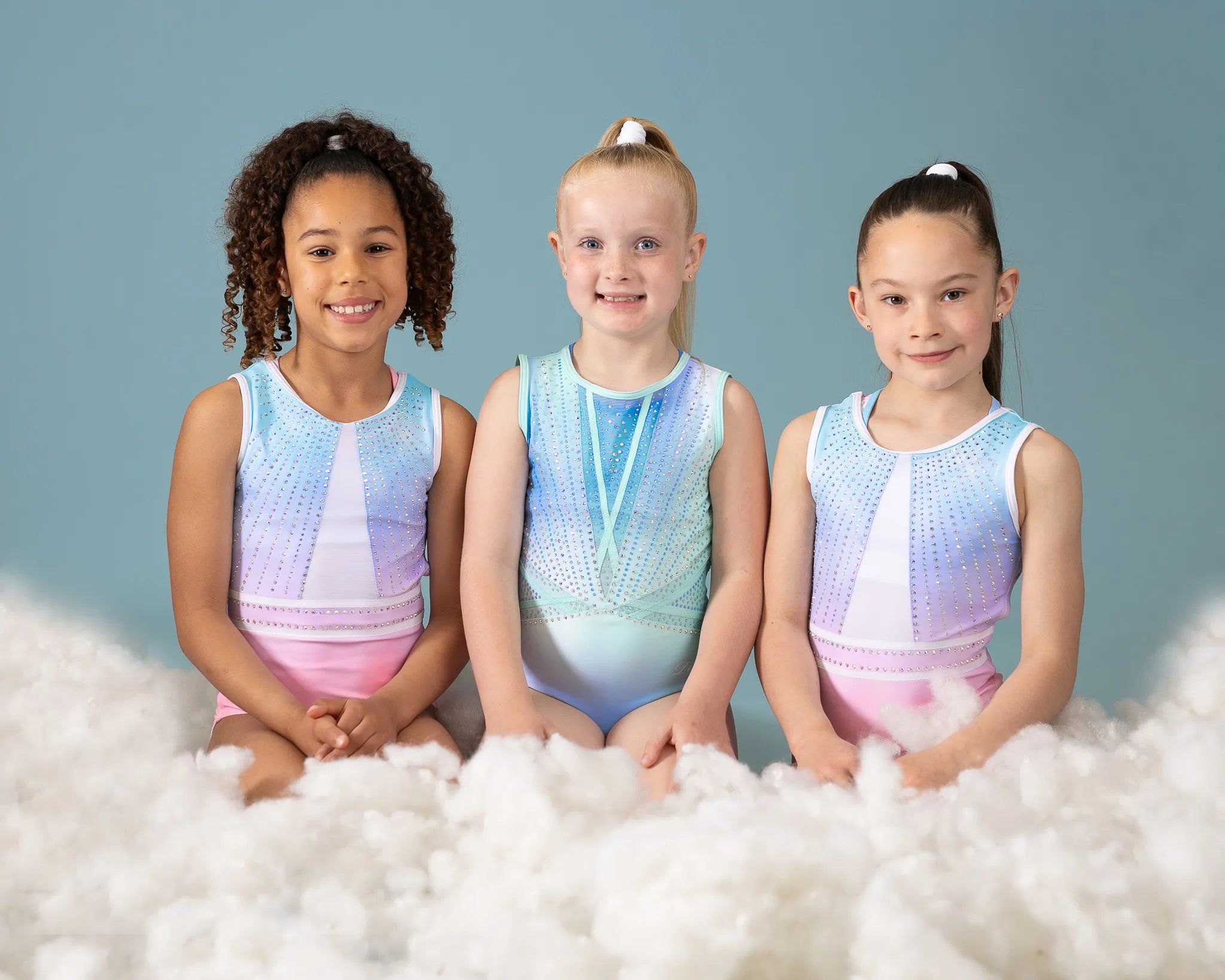 Das Sweet Dreams Set beinhaltet sowohl ein vollflächiges Lycra Turnanzug als auch ein passendes Crop Top in einer sanften, wolkeninspirierten Farbpalette aus Babyrosa, Blau, Koralle und Weiß. Das Trikot besticht durch einen sanften Allover-Druck, schmeichelhafte Einsätze und eine Streuung von AB Korean Steinen für den perfekten Hauch von Glanz. Mit einem vollständig gefütterten Innenfutter und sicherem Sitz ist es für selbstbewusste Bewegungen und traumhaften Stil gemacht.