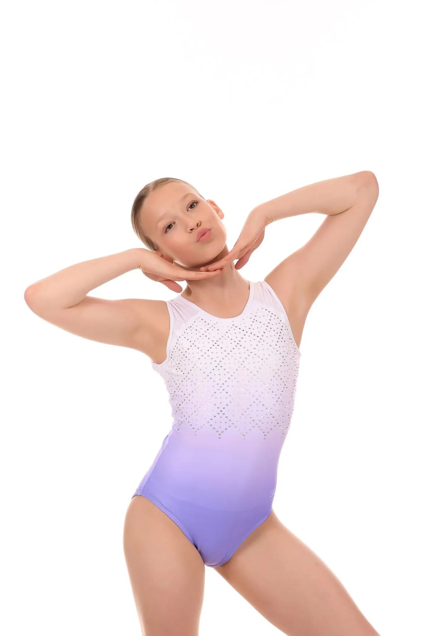 Float through training or step up to the spotlight in the Marshmallow 2.0 – the upgraded fan favourite that blends comfort, sparkle, and a touch of sugar-sweet style. This dreamy sleeveless leotard fades from soft white to lilac in a gentle ombré, scattered with shimmering crystals in a delicate diamond formation.
