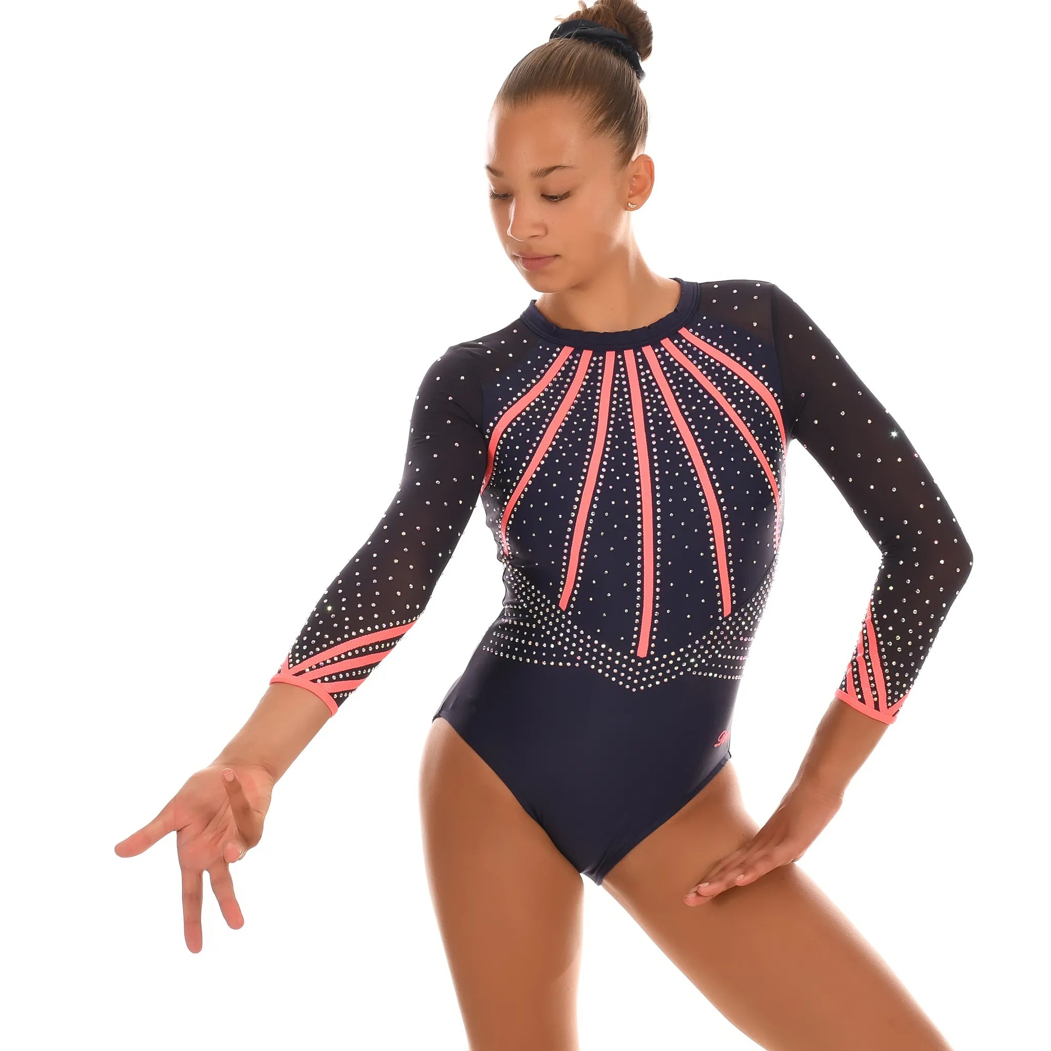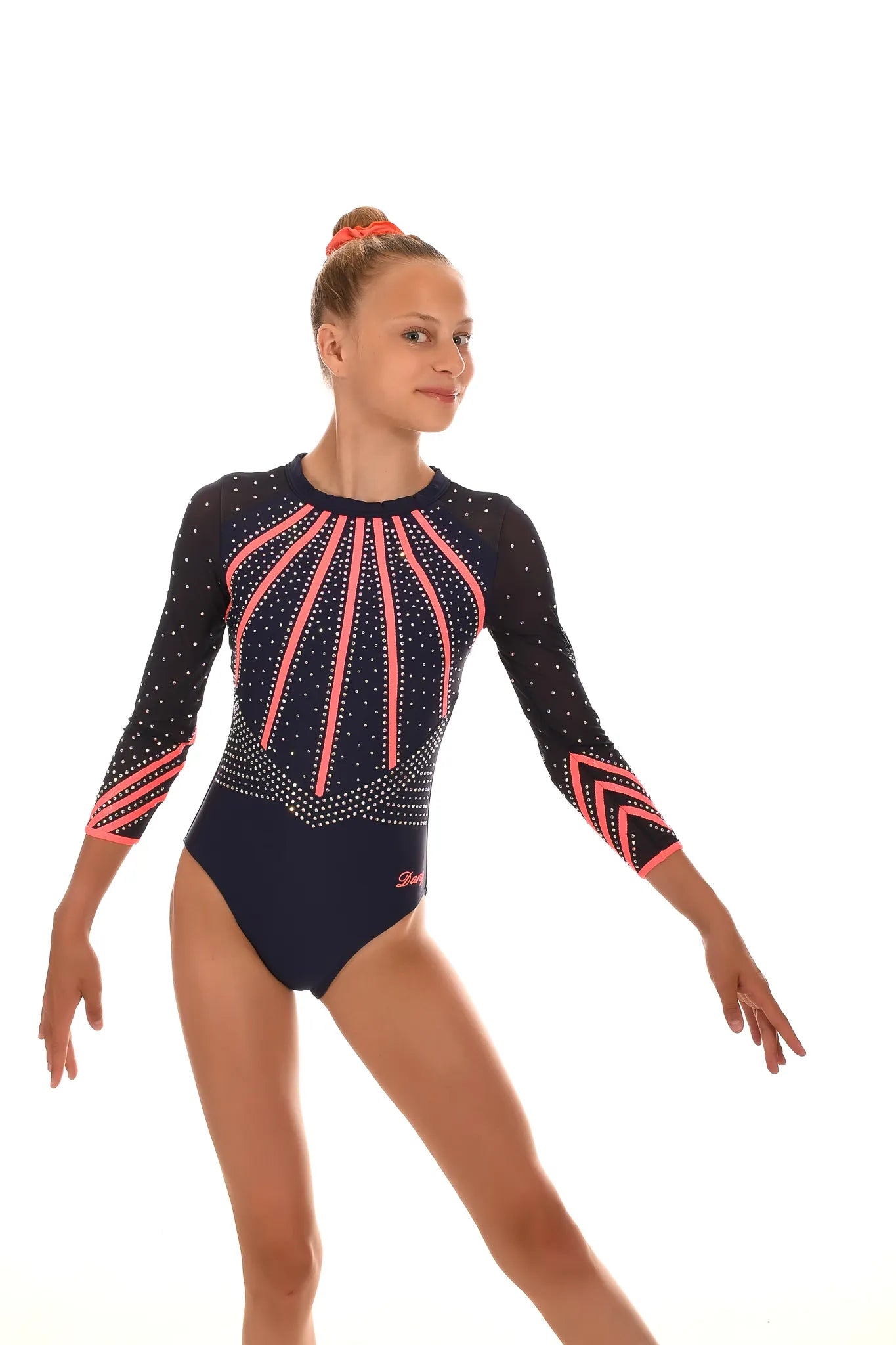 Looking for a leotard with that pop of colour ... well then Ray is the one for you! In this beautiful colour combination of Navy Blue Lycra and with eye-catching Neon orange mystique appliqué detail overlaid on a mesh bodice, this leotard design really does standout! With a sophisticated high neck and open back and super sparkly AB crystals Ray is perfect for those gymnasts who love to sparkle.